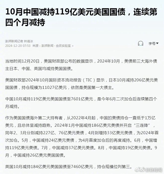 好意思国财政部2024年10月国际老本流动评释(TIC)闪现,日本10月减抓206亿好意思元好意思国国债,抓仓限制为11027亿好意思元,仍是是好意思国第一大借主。
