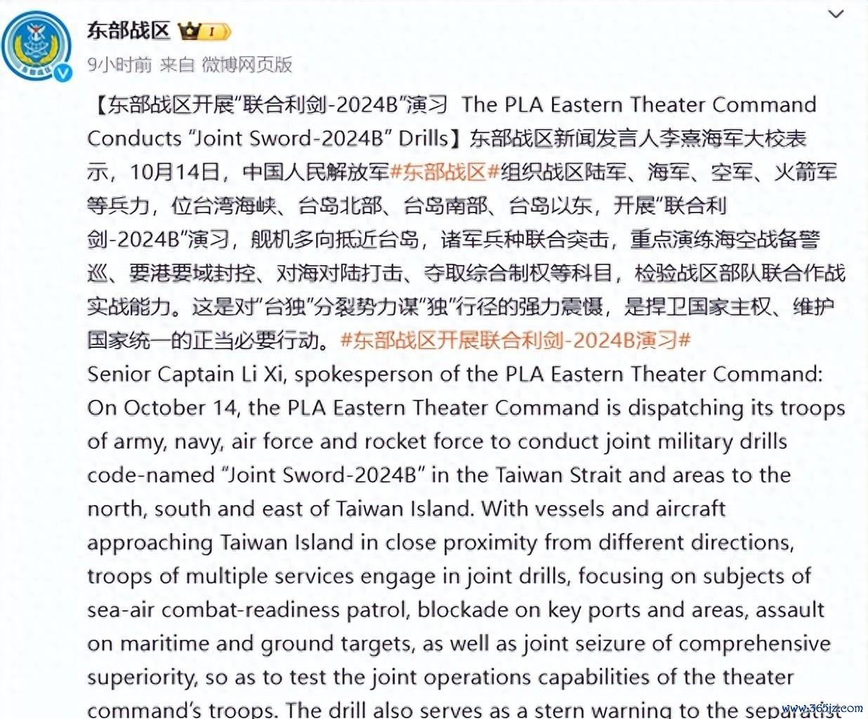 10月14日凌晨,当国东说念主还在沉睡之际,自若军东部战区在夜幕中拉开了“融合利剑-2024B”演习的帷幕。在短短数小时内,舟师、陆军、空军和火箭军等各兵种接踵挪动,进行了融合突击、重心区域封控以及夺取海空制权等有针对性的演练。