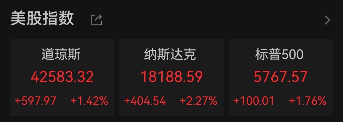 中新经纬3月25日电 好意思东技巧周一,好意思股三大指数集体上升。摈弃收盘,谈琼斯指数涨597.97点,涨幅1.42%,报42583.32点;纳斯达克指数涨404.54点,涨幅2.27%,报18188.59点;标普500指数涨100.01点,涨幅1.76%,报5767.57点。